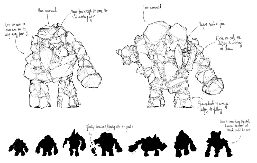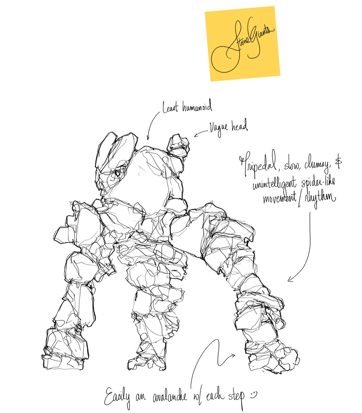 I wanted to approach these a little differently. Being that they are entities formed from the very earth they live in, I wanted to embrace the natural formation of rocks—as opposed to the traditional humanoid golems.