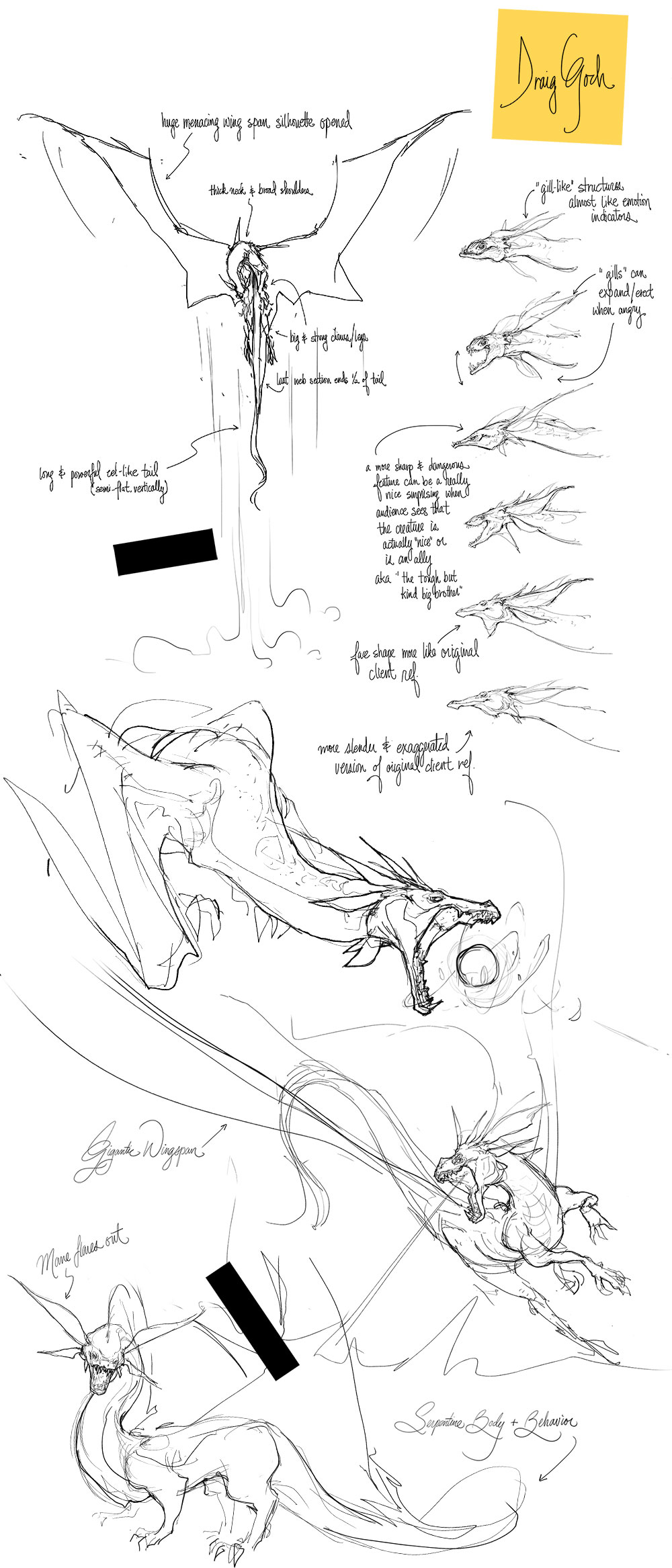 Concept Sketch / Design considerations for head, gestures, poses, and overall form-language of the dragon. I Had to act out a few poses myself.