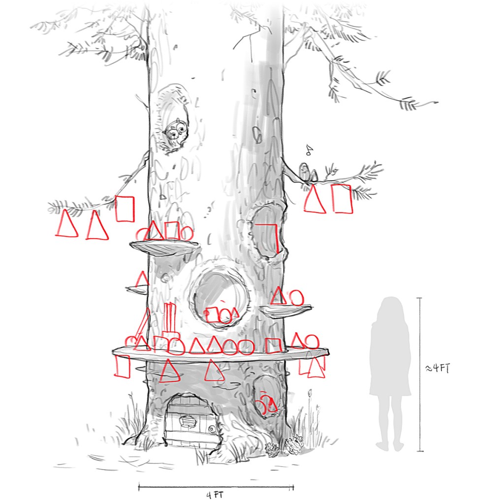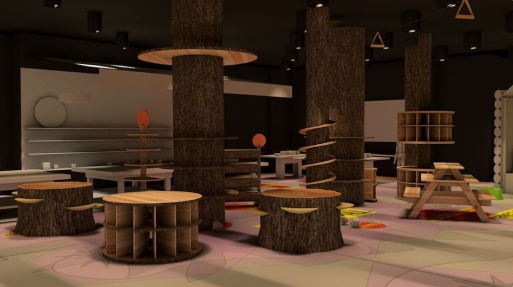 Below is what CAMP calls The Grove. Inspired by light-dappled forest clearings, this area was at the heart of the store. We envisioned it being filled with hidden “easter eggs”. Our goal was to creatively conceal merchandise throughout and have kids embark on a treasure hunt guided by sensory cues.