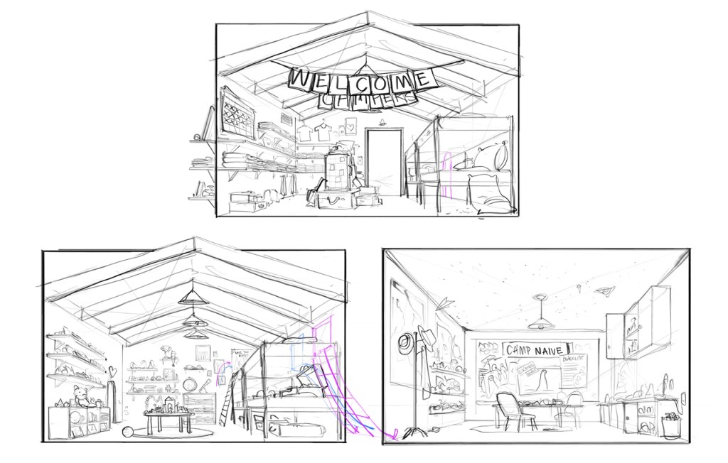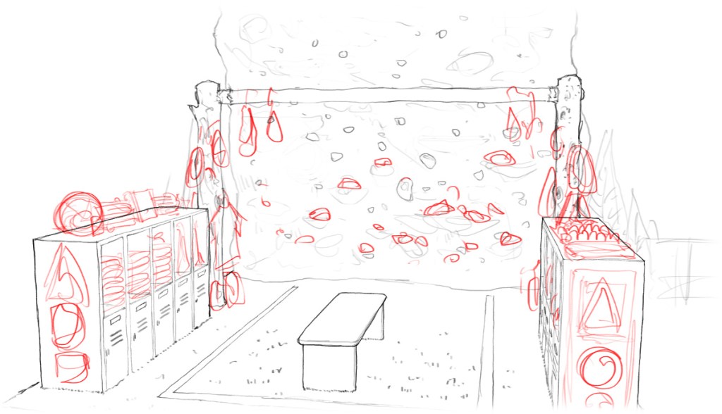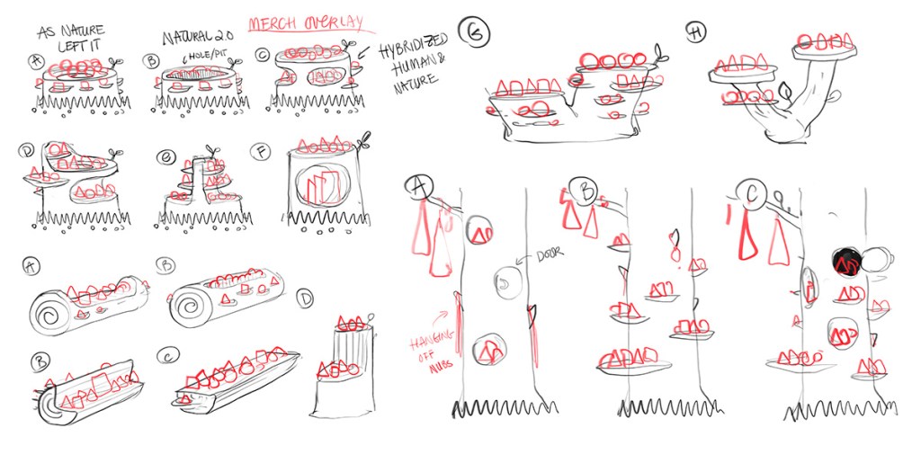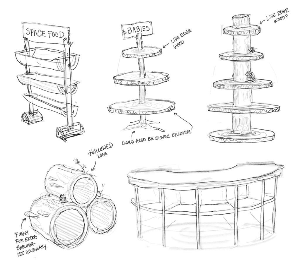 Concept Sketch / How do we disguise fixed elements (like columns), stay within theme, and display merch?
