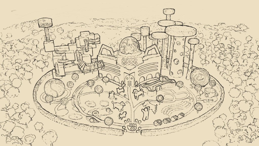 Do we see topiary sculptures outside as dog shapes? Do we have dog bone mazes as a place to make calls and have breaks? Are some offices in tall cat-scratcher trees? Are the trees made of yarn? Is the building a cat? The list goes on and on and on.