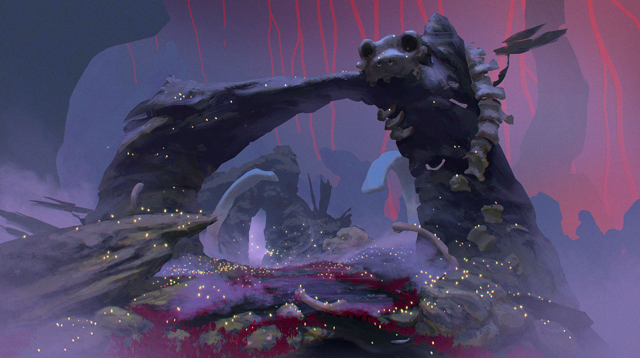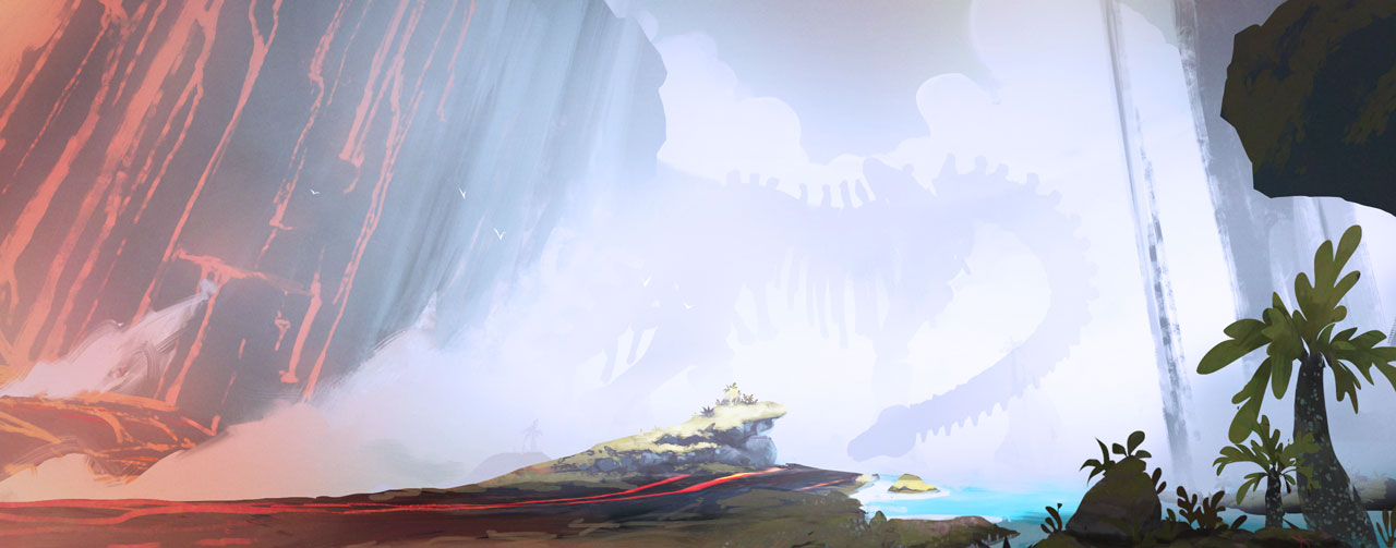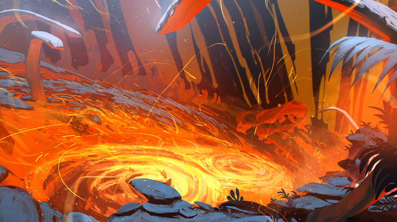 Concept Painting / Everything in this area has been scorched by the heat, if not the lava itself, leaving only the skeletal remains of life.