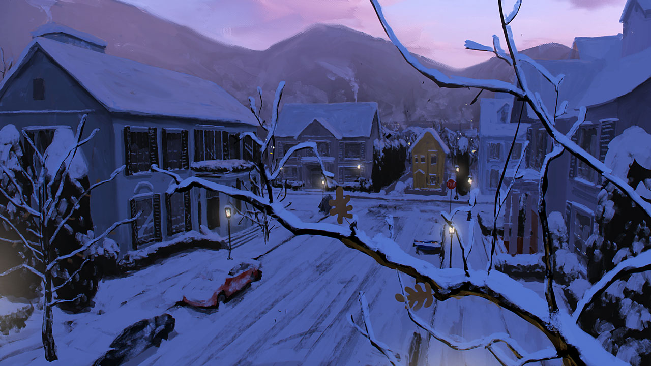 Concept Painting / The camera slowly zooms into the top floor of the little yellow house.
