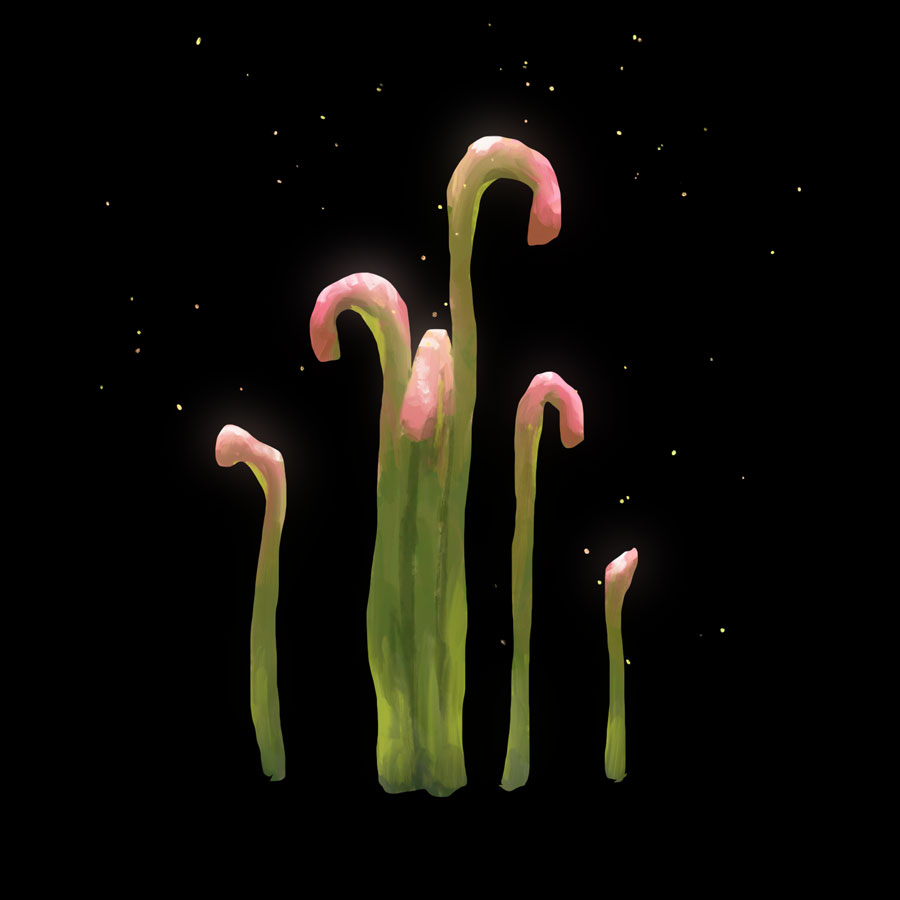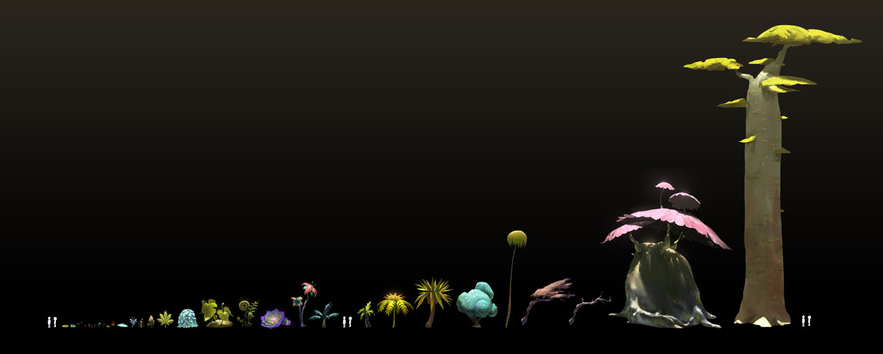 Since this world is set in a jungle environment, ordinary plants just wouldn’t cut it. Using the character height silhouettes for scale, I designed a diverse range of “signature plants” unique to each major region. Every plant was carefully designed to reflect the characteristics of its specific habitat.