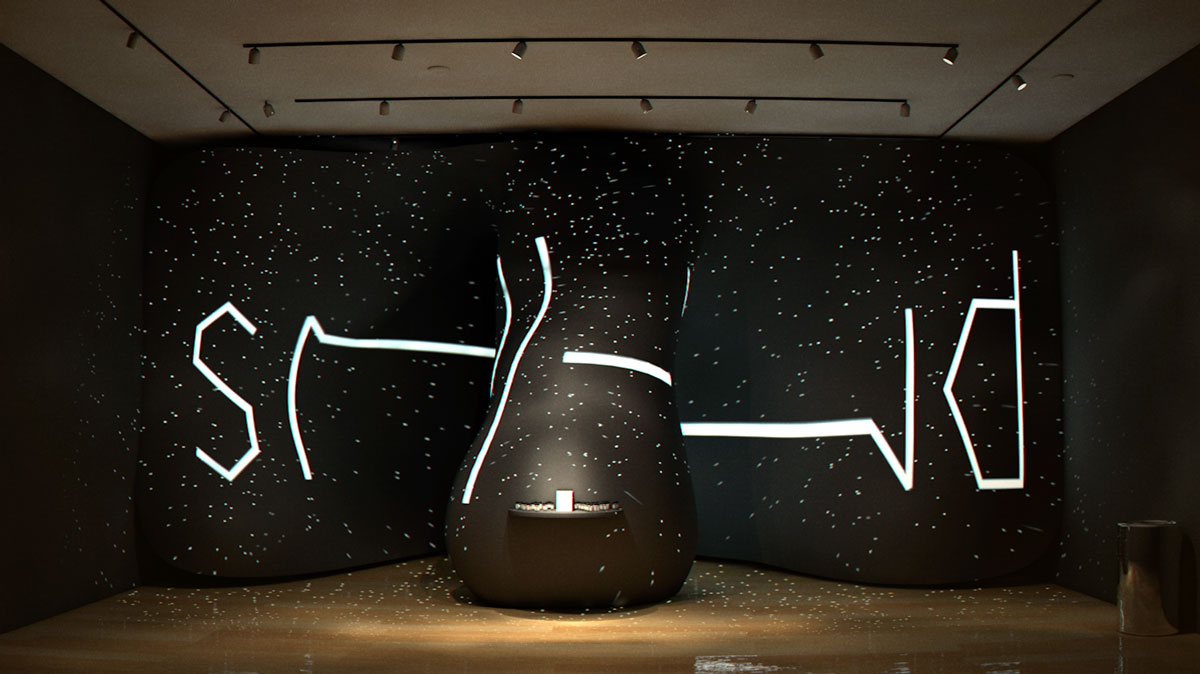 3D Model / Two-door entry inspired by our two nostrils—as if the exhibit is about to sniff you (and the logo) in. Projected particles represent the invisible smell molecules in the air around us. Also, notice the dark walls. I wanted to create an olfaction exhibit where the environment helps users focus on using their nose to navigate.