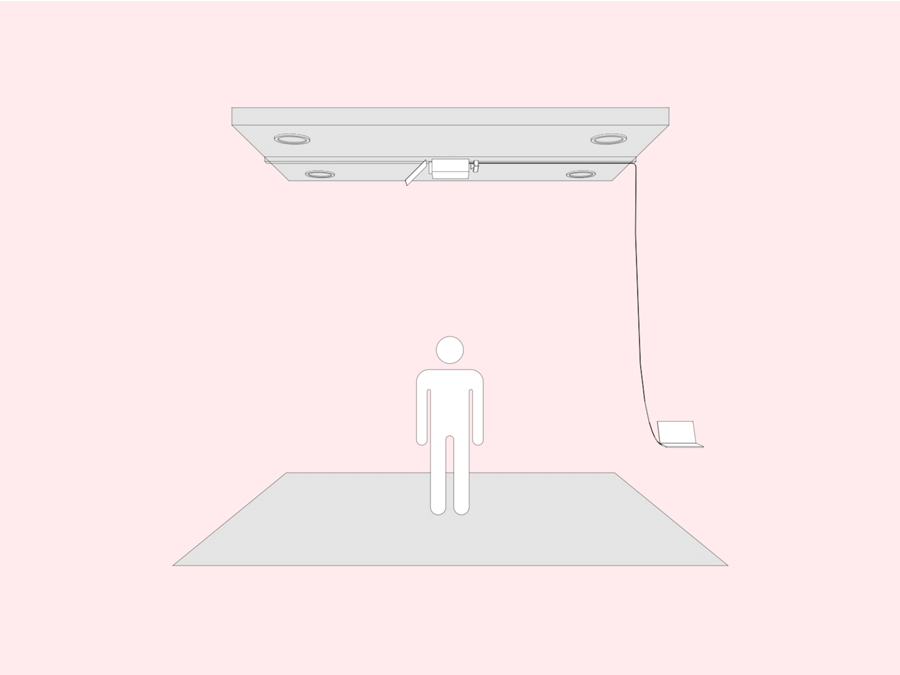 How It Works / 1 Kinect sensor and projector is mounted on ceiling. 2 Sensor sees user and sends new data to computer. 3 Computer sends projector new imagery.